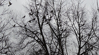 Dziś pobliskie drzewa odwiedziło stado ptaków, olbrzymie stado. W dodatku niejednorodne. Były tam różne ptaki, podobne jednak pod względem wielkości. Ponieważ tuż obok jest osiedle domków jednorodzinnych z ogródkami a cały rejon to byłe tereny ogrodnicze, było się czym żywić.
